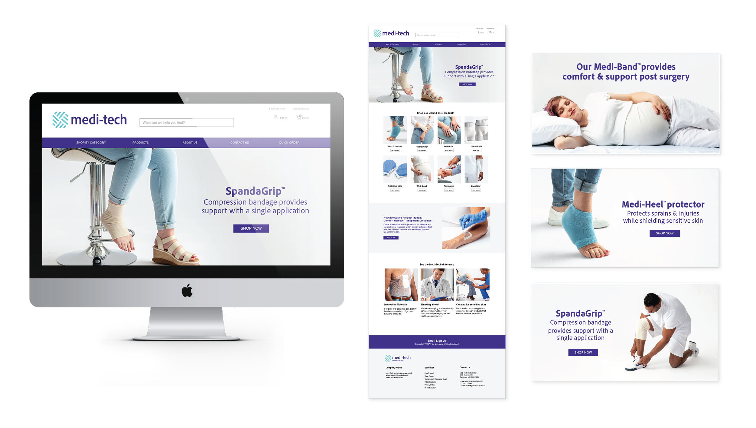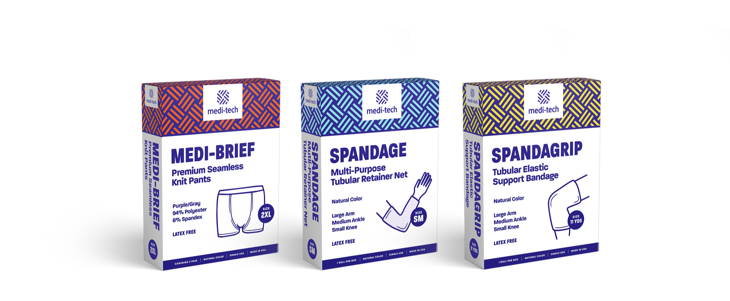 The packaging design for Medi-Tech products was developed with both distributors and the target audience in mind. Key considerations included making the product type easy to identify through a color-coding system based on product categories (e.g., Medi-Briefs, Spandage, Spandagrip). We also wanted to ensure that the product is visually represented on the packaging for easy identification and retrieval from storage shelves. Large callouts for size and color variations were included to accommodate the many options available.